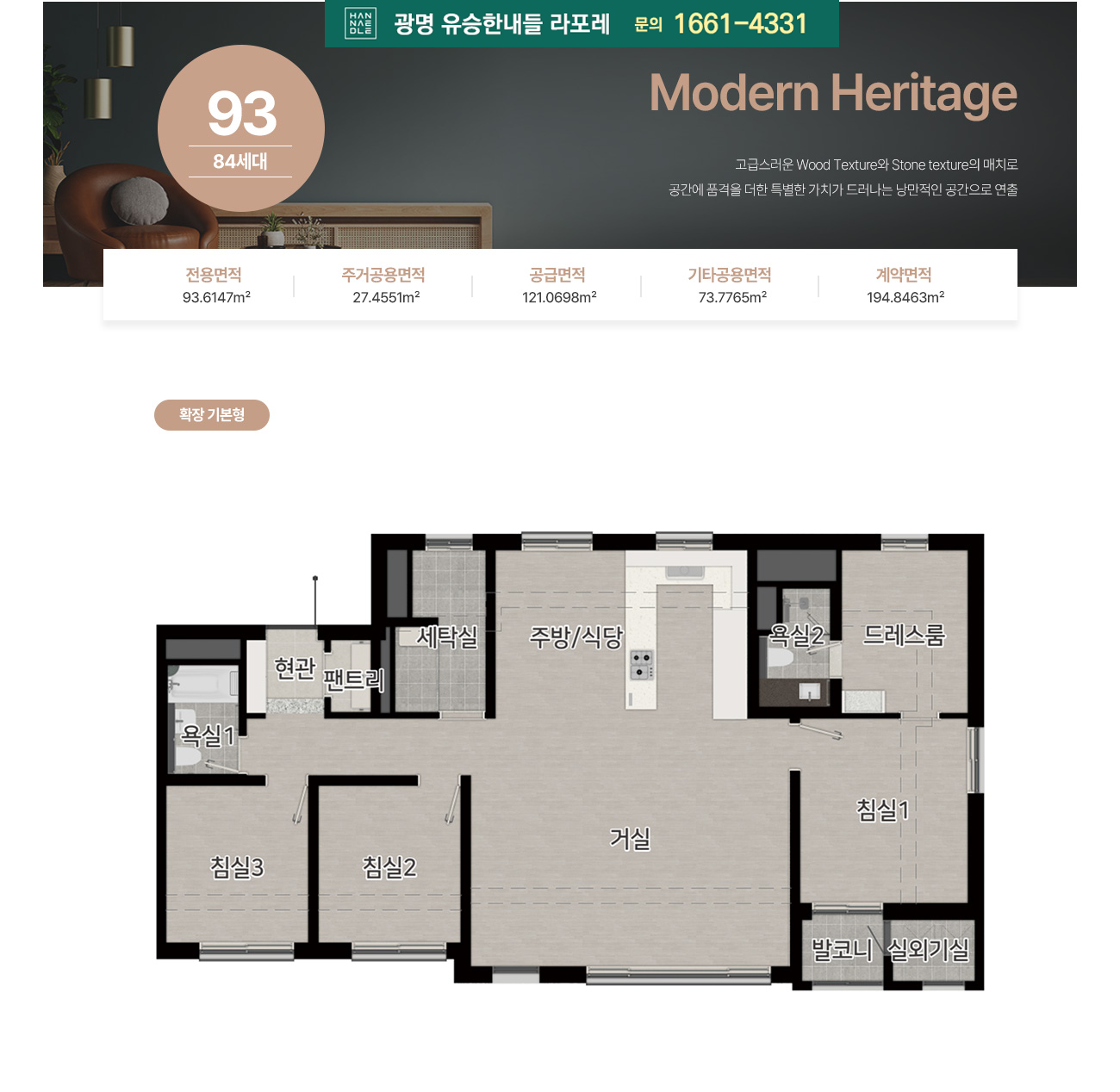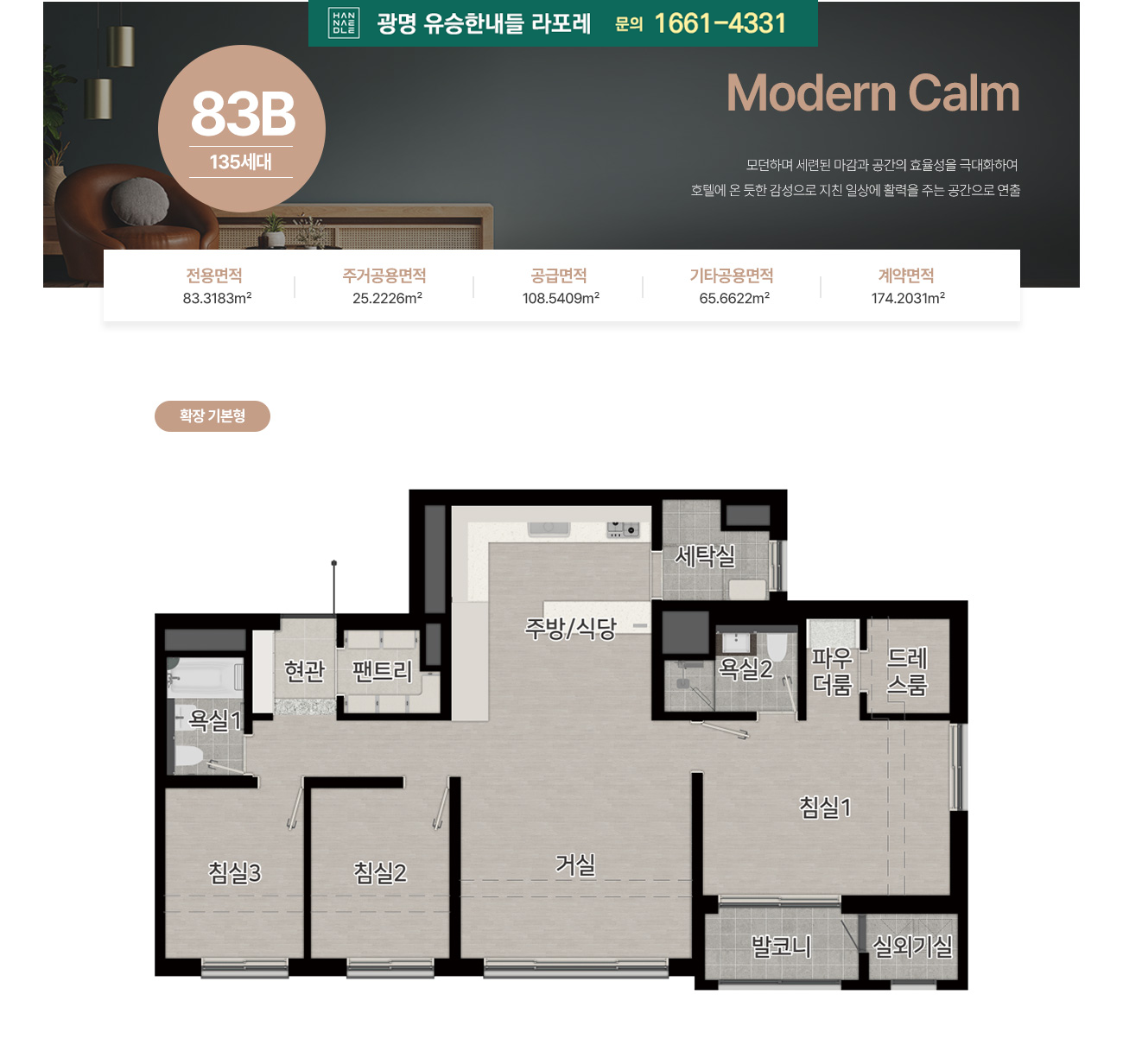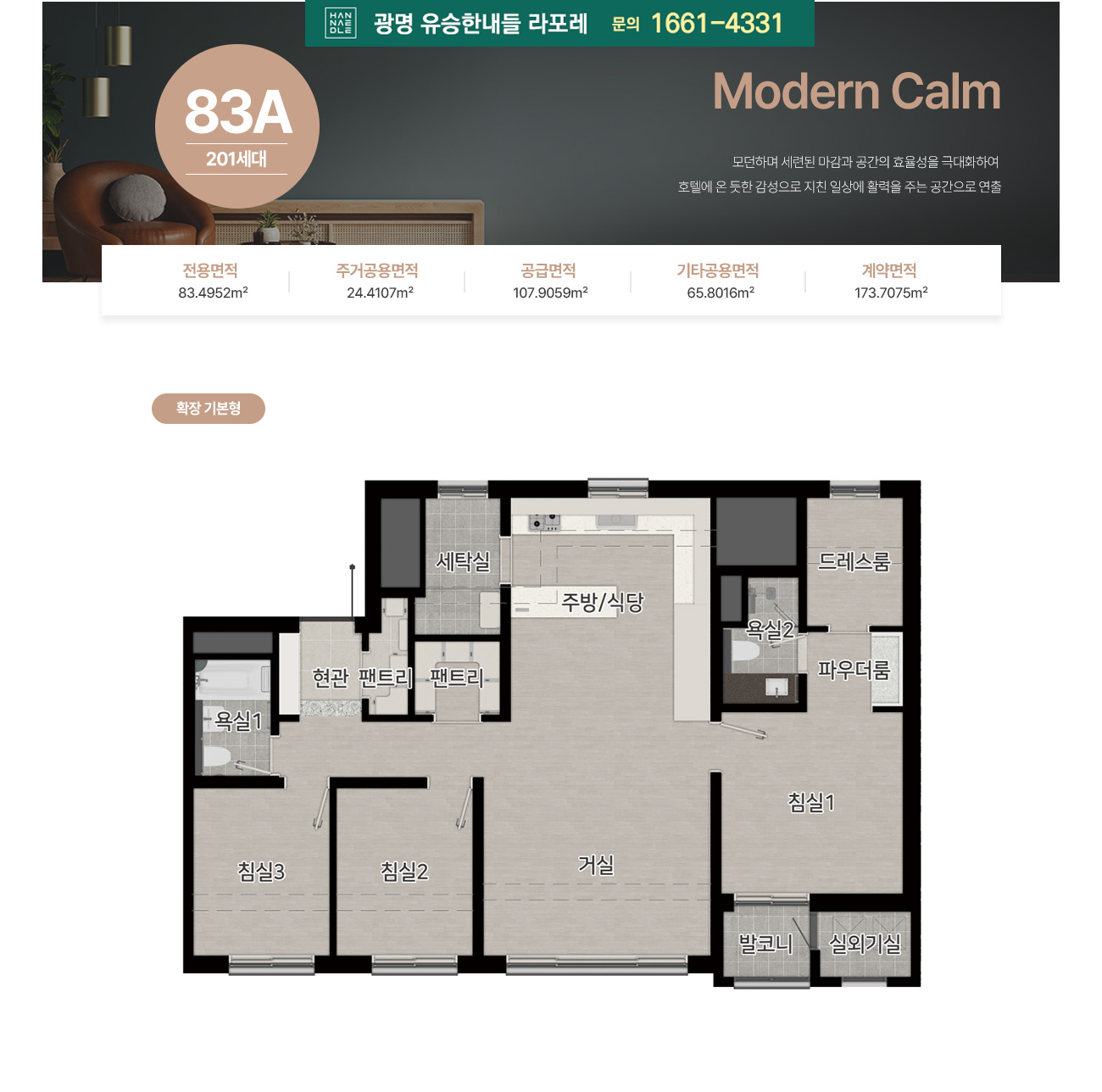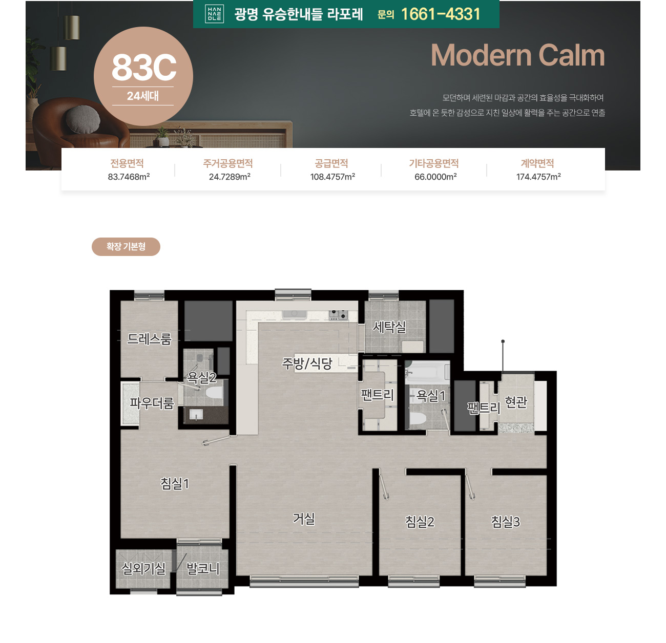 아파트는 전용면적 83㎡와 93㎡의 중대형 평형으로 구성되어 있으며, 광명시에서 희소성이 높은 4베이 설계로 구성됩니다.